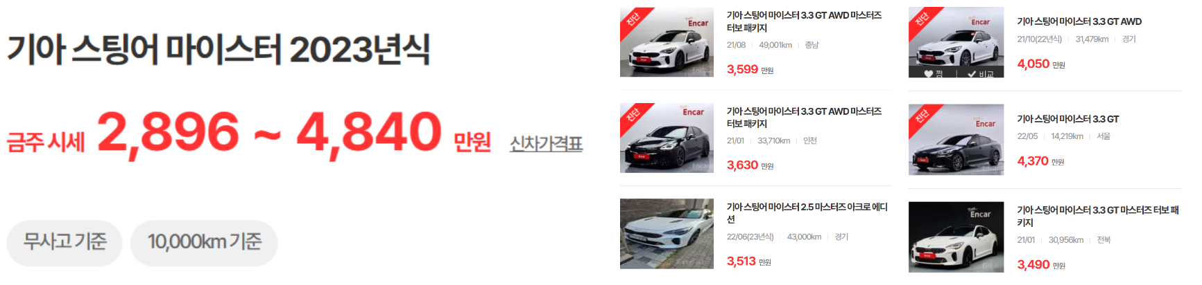 스팅어 차량은 중고시세가 매우 다양한 차량입니다.
