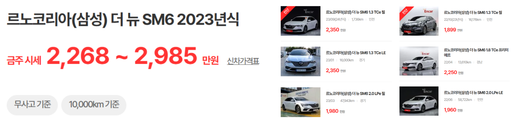 SM6 23년형 무사고기준 시세는 2천 초반부터 2천 후반까지 형성되어 있으며 현재 신차의 경우 2 천후반부터 3천 중후반까지 형성되어 있는 것을 보았을 때 신차보다는 중고차를 구입하는 것을 추천드립니다.
