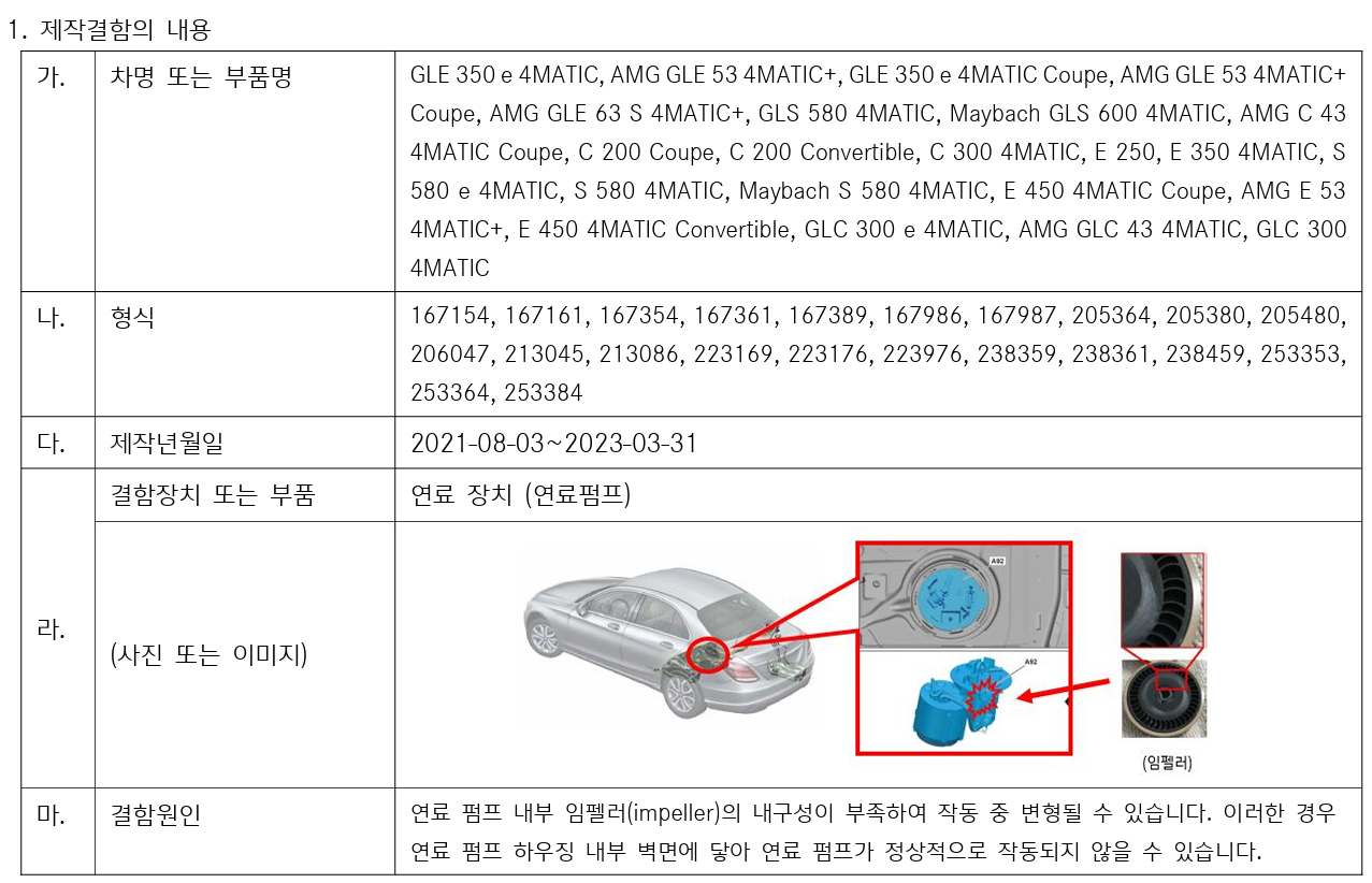 24년 2월 벤츠 차량 중 20여 대 차종에서 연료펌프 문제로 결함이 발생되었습니다.