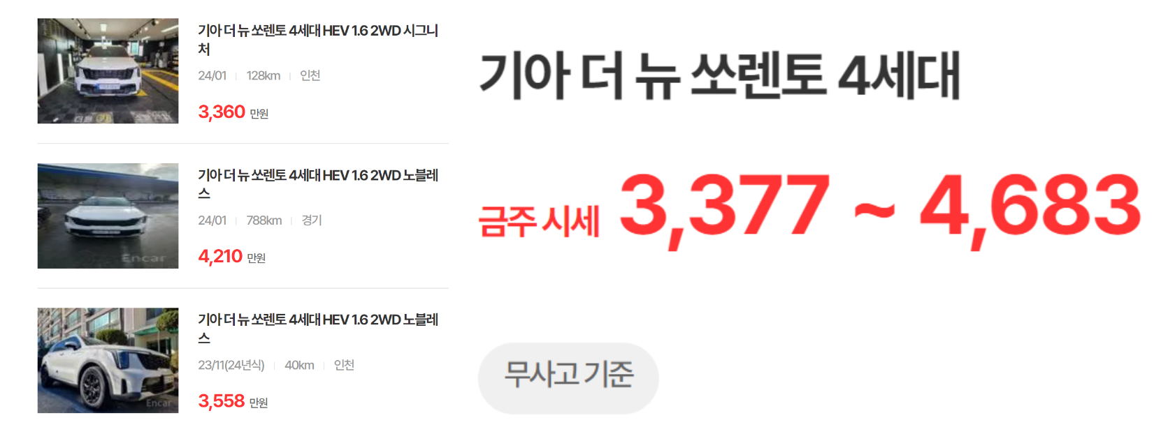 신형 쏘렌토 페이스리프트 버전으로 현재 대략적인 시세는 3천 초반부터 4천 후반까지 형성되어 있습니다.