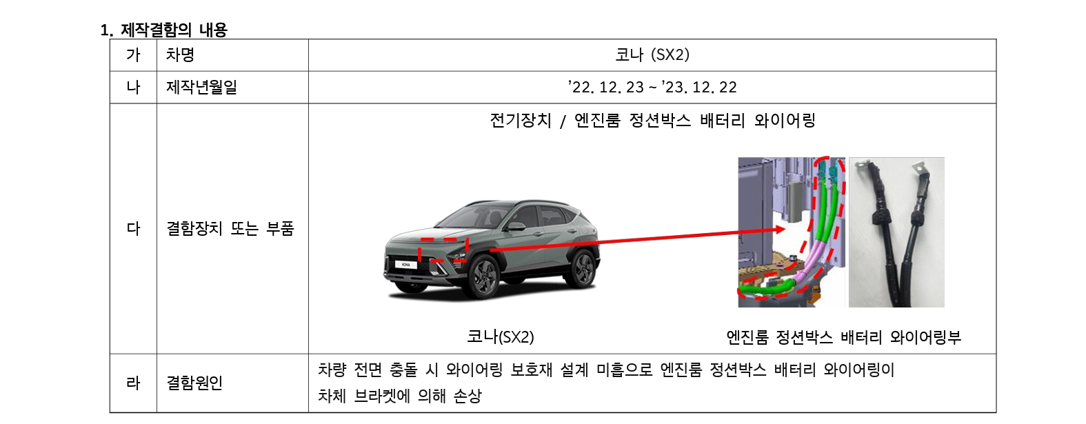 코나(SX2) 가솔린 1.6T 엔진 사양 일부 차량에서 차량 전면 충돌 시 와이어링 보호재 설계 미흡으로 엔진룸 정션박스 배터리 와이어링이 차체 브라켓에 의해 손상되어 단락으로 인한 화재가 발생할 가능성이 있는 결함 문제