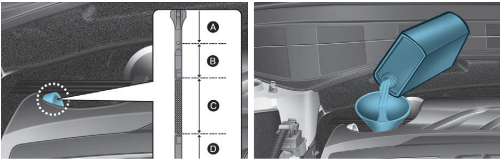 - 오일양이 D구간에 있다면 엔진 오일 주입구를 열고 C구간 상위까지 오일을 보충한 후, 오일양이 규정량에 속하는지 레벨 게이지로 다시 확인 합니다.