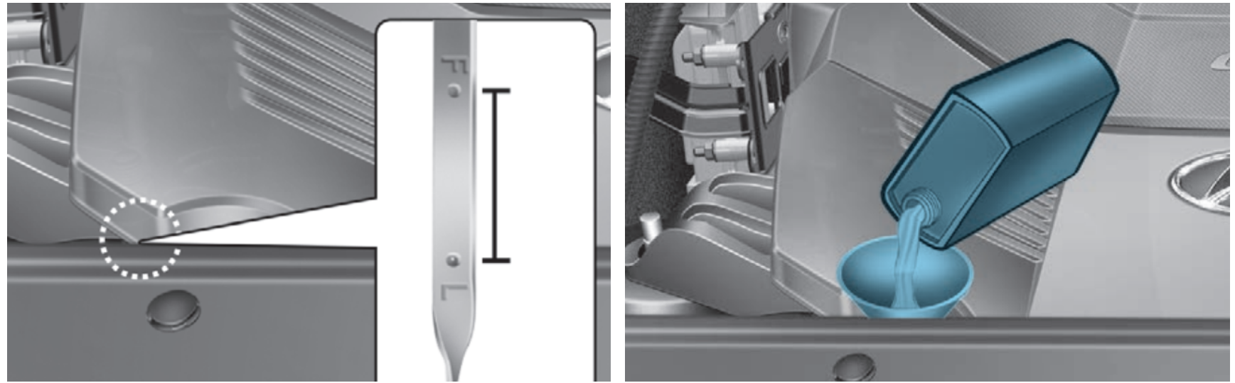 - 보충 후에는 오일양이 규정량에 속하는지 레벨 게이지로 다시 확인하십시오.